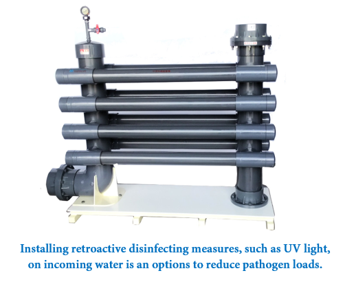 1. L'idéal est d'identifier une source d'eau biosécurisée lors de l'implantation d'une nouvelle installation. Cependant, la consommation d'eau réduite des systèmes RAS peut faire de l'installation de mesures de désinfection rétroactives, telles que la lumière UV , sur l'eau entrante des options viables pour réduire les charges pathogènes. Des mesures supplémentaires doivent être prises pour protéger les sources d'eau des animaux sauvages en les recouvrant ou en les enfermant.