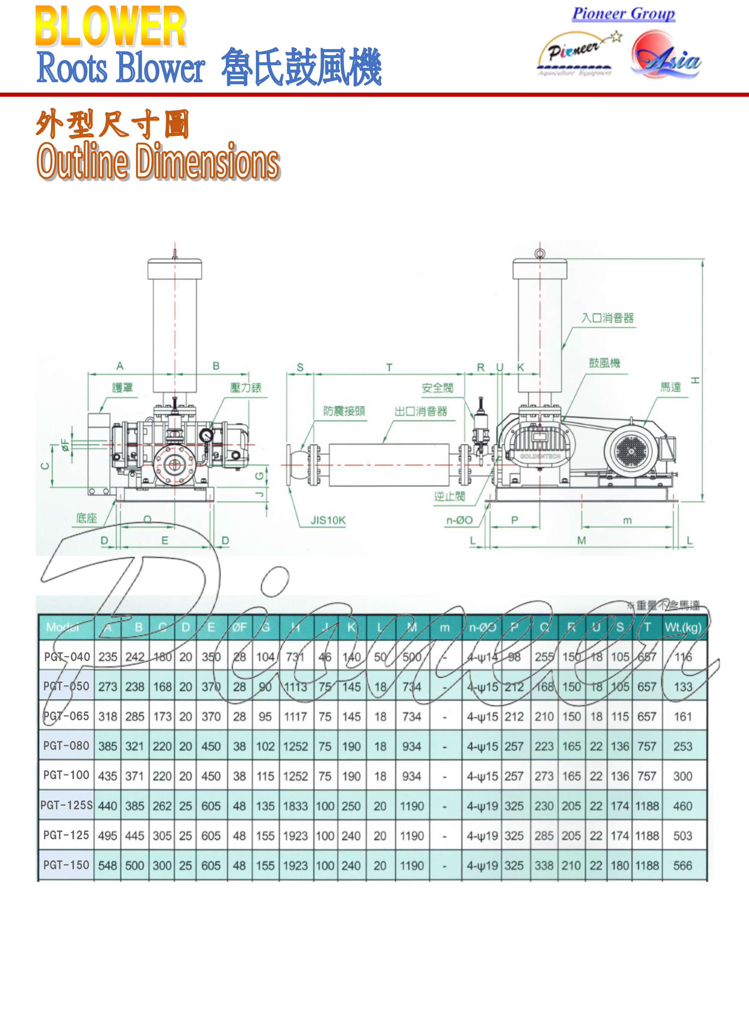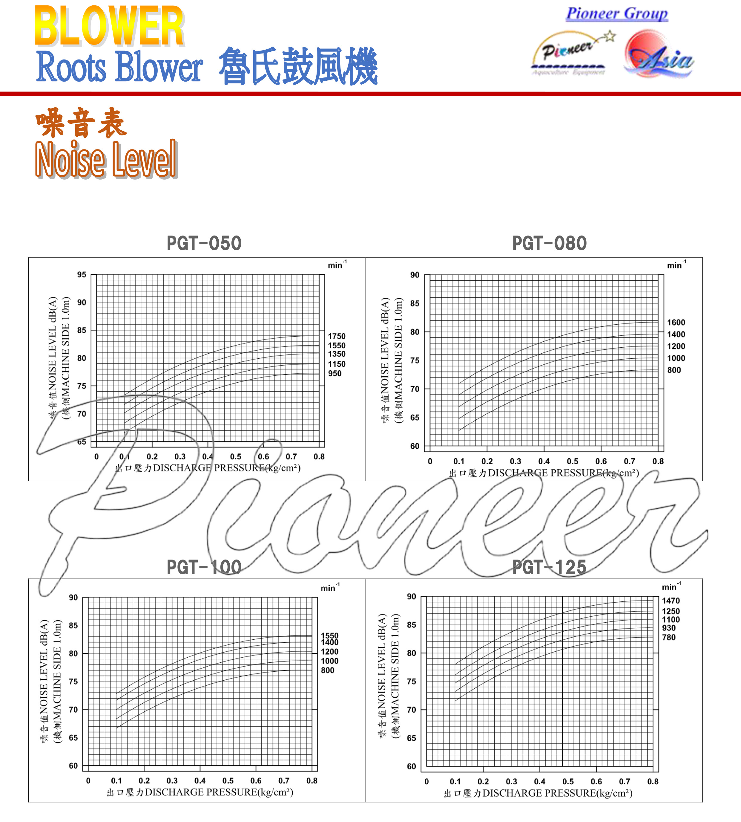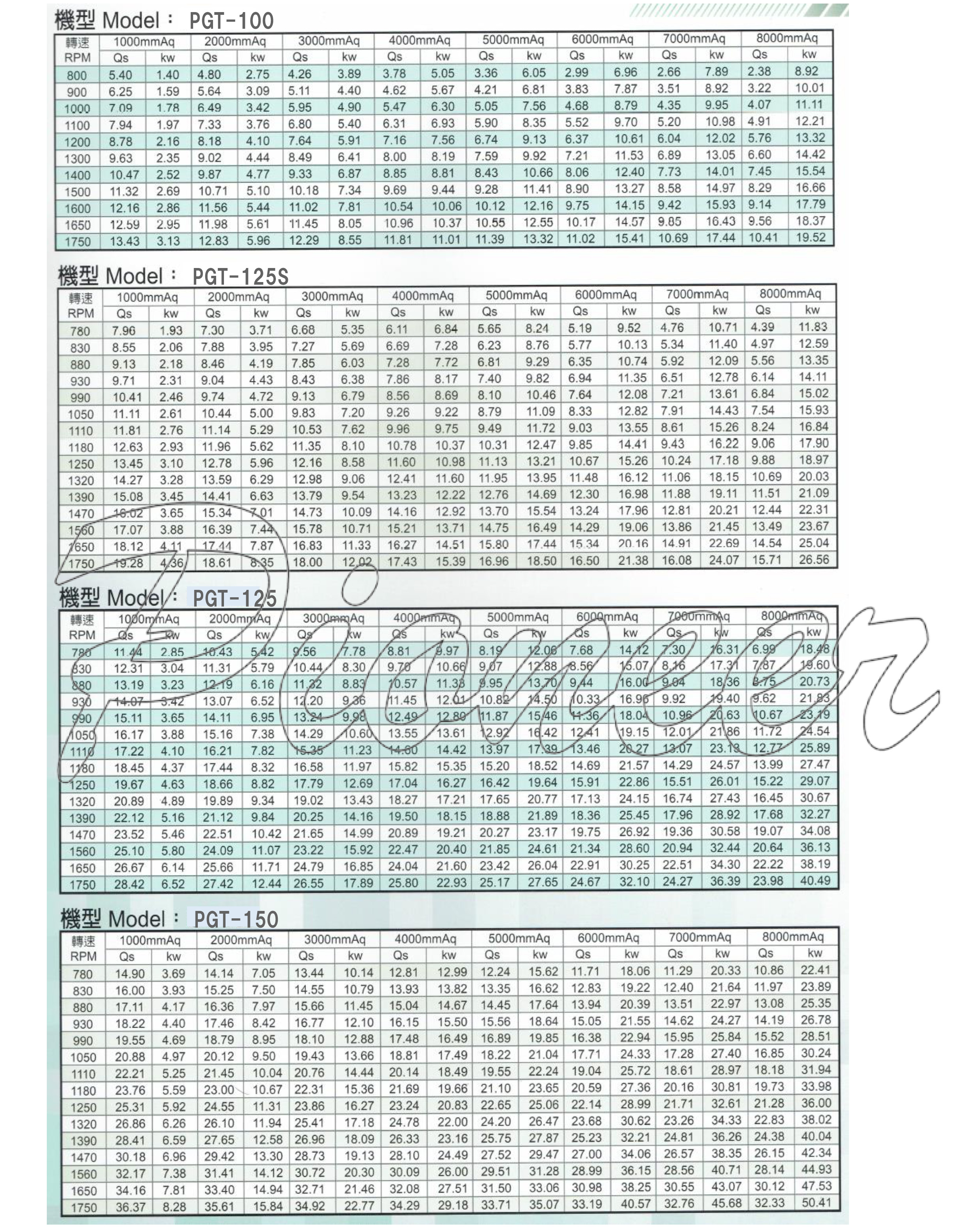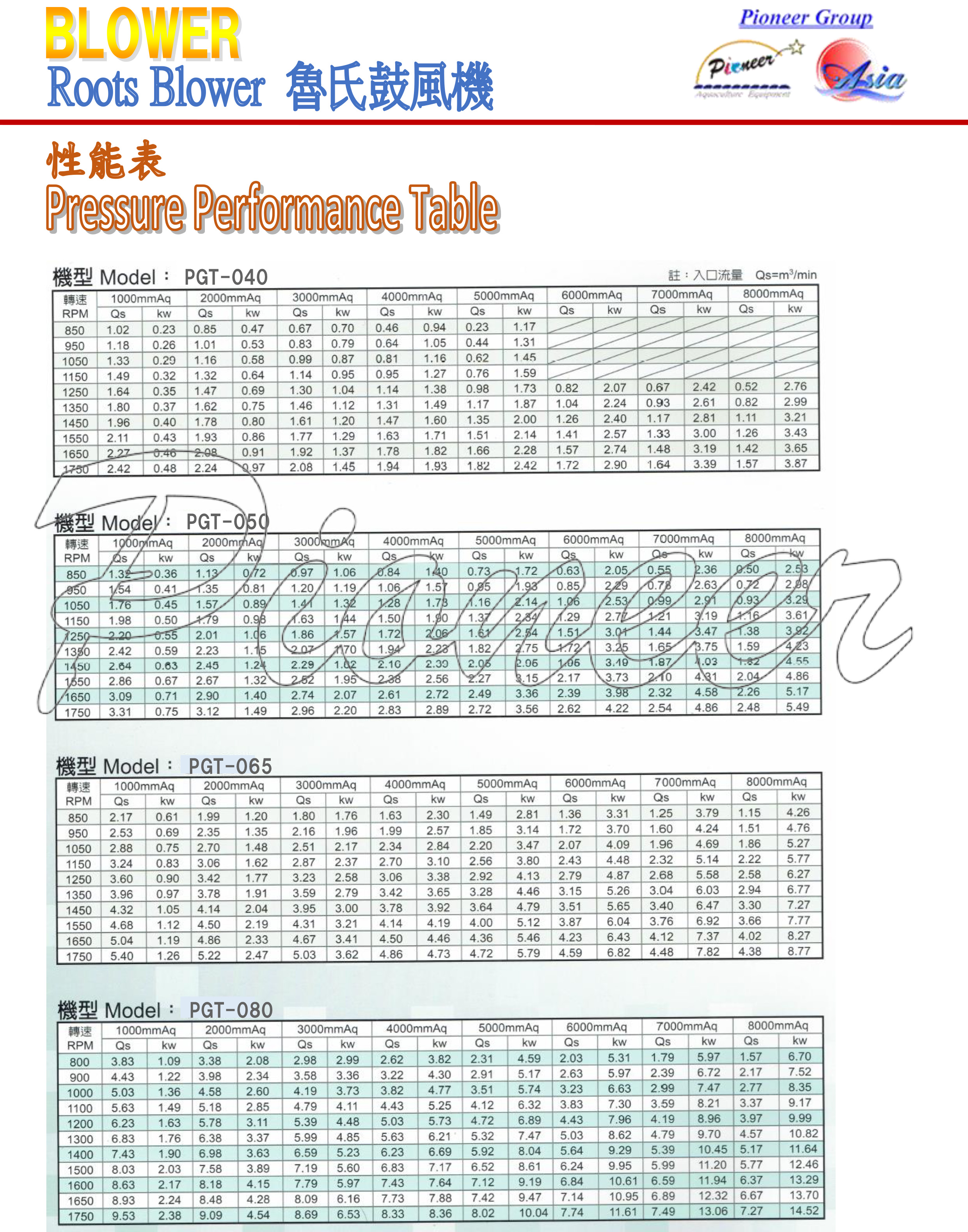 - Pression: type PGT, première étape, 7000 mmAq (0.7 kg/cm2)