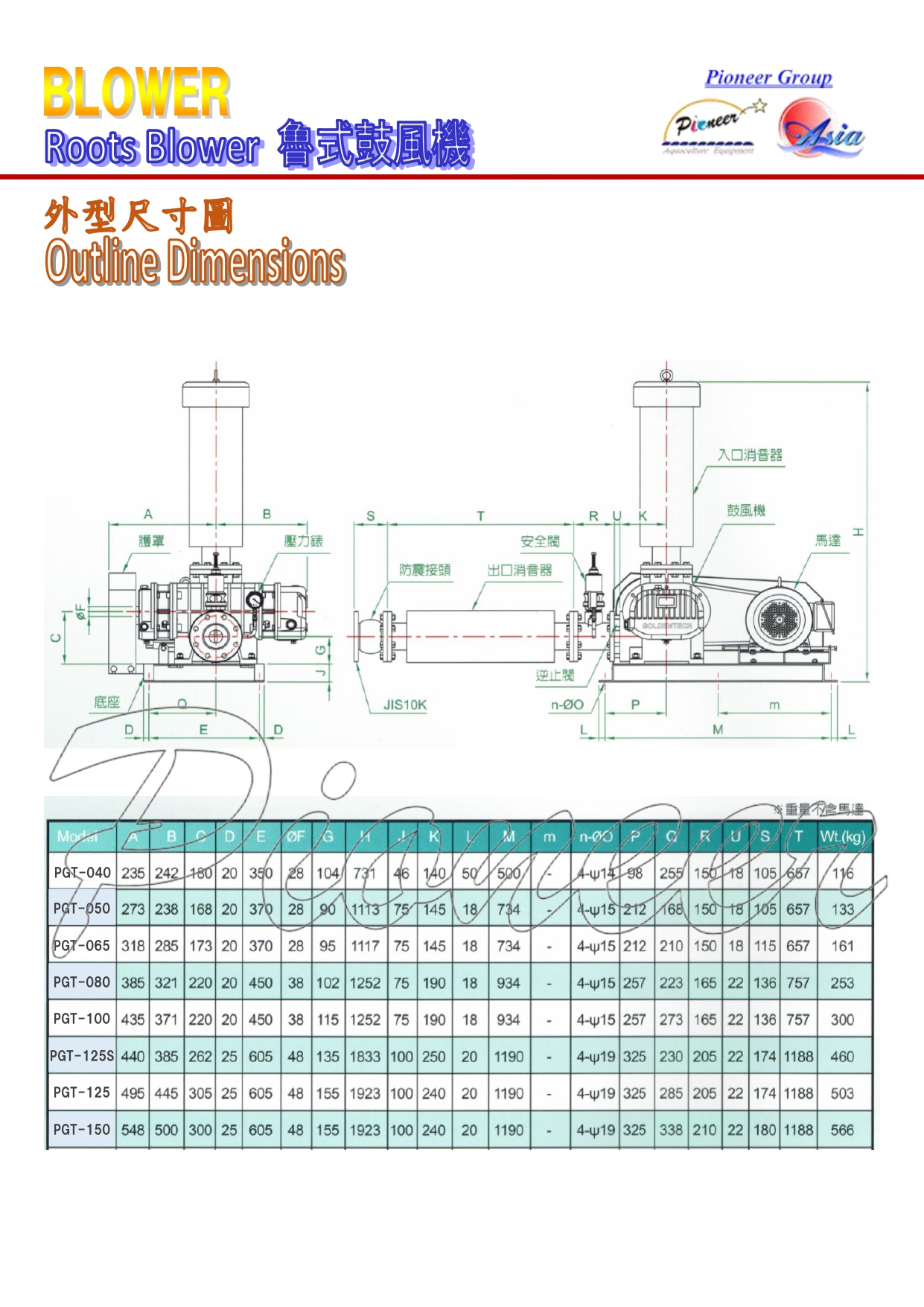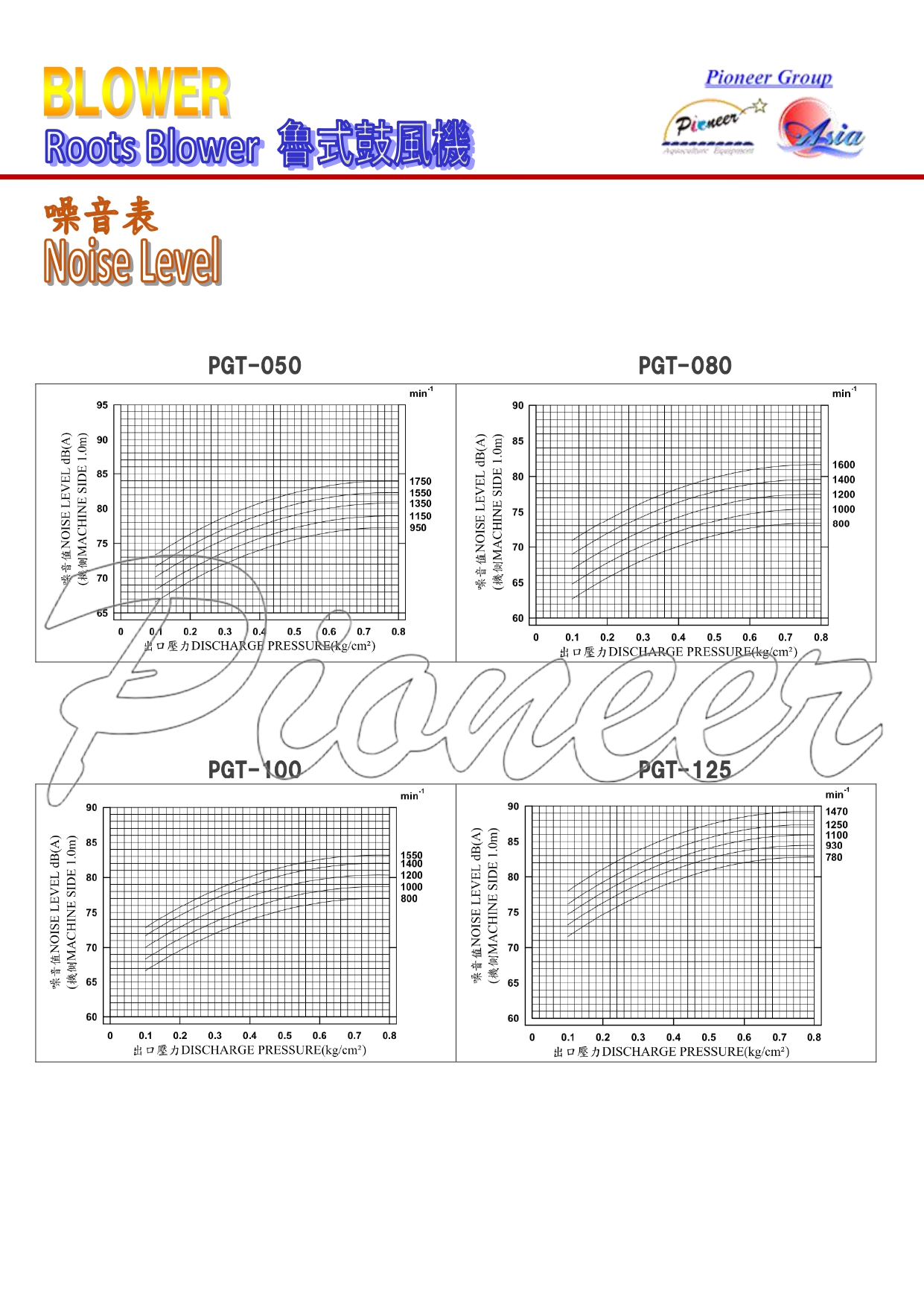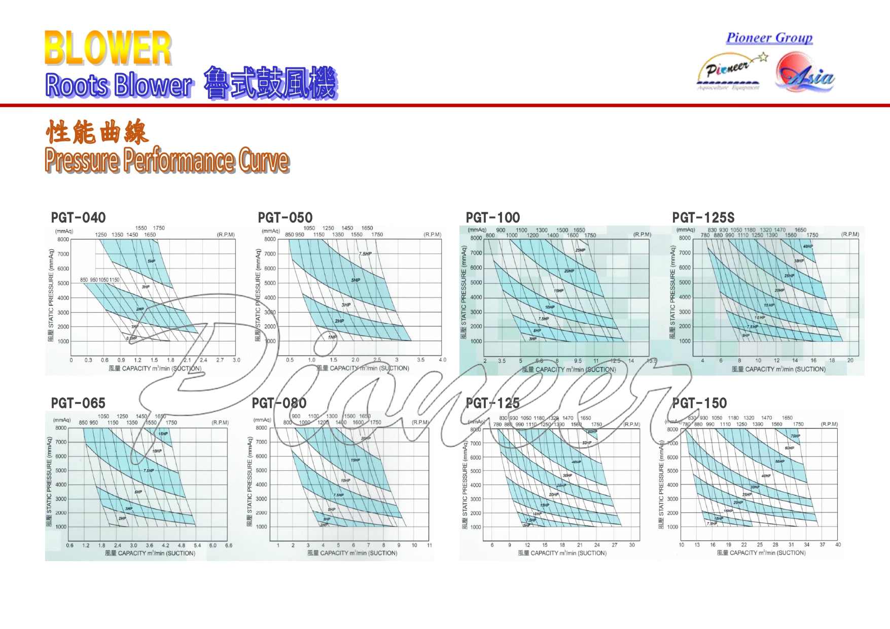 - Pressure: PGT type, first stage, 7000 mmAq (0.7 kg/cm2)